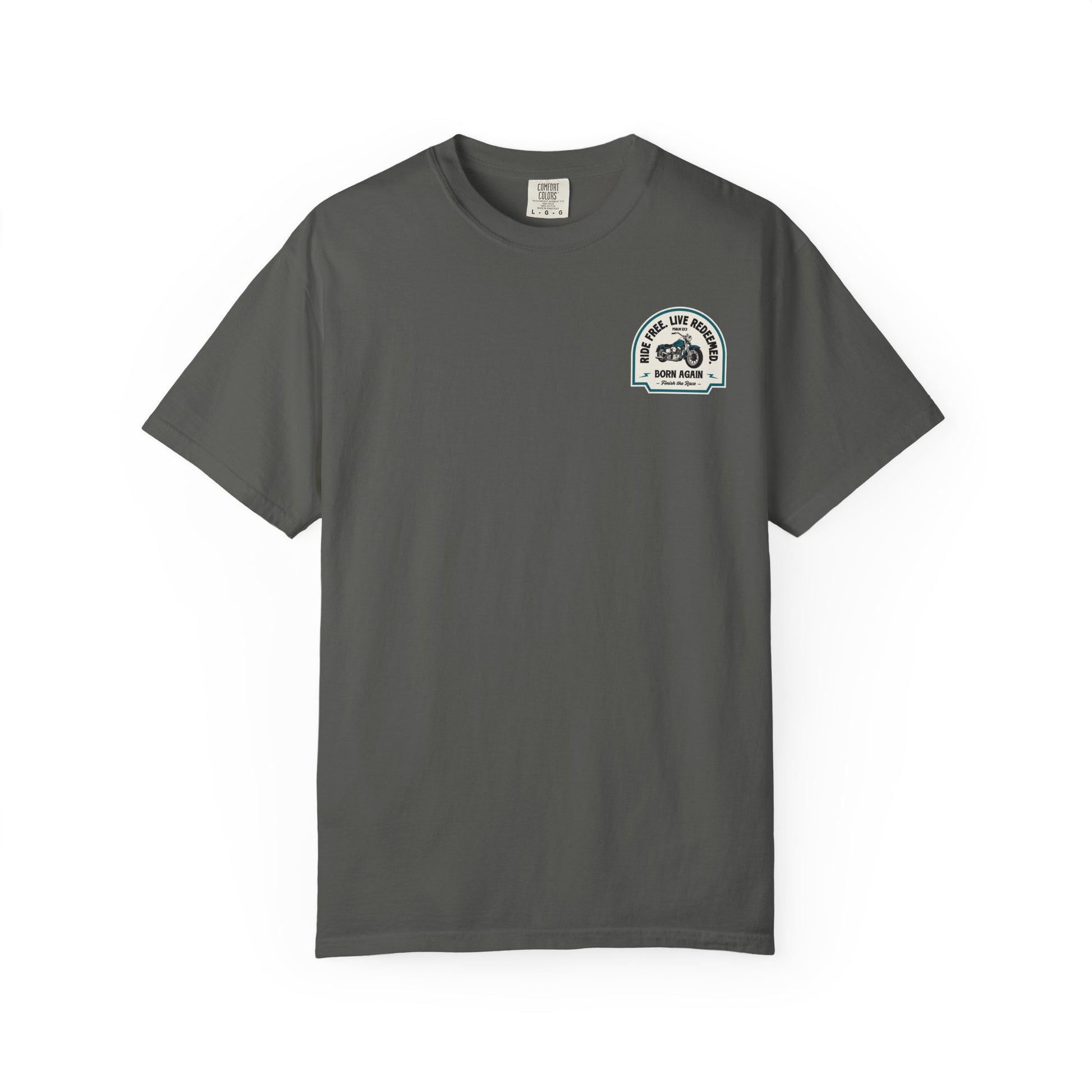 With “Finish the Race” waving across the flag and “Ride Free, Live Redeemed” marking the journey, this tee is made for those who know what it means to be revived, redeemed, and truly born again.
